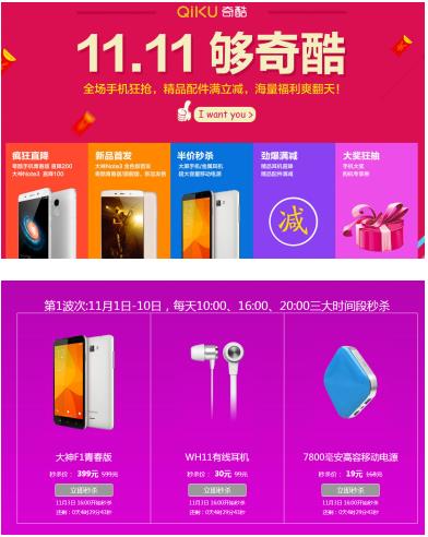 再来看看360奇酷手机,奇酷在天猫的奇酷大神旗舰店和奇酷商城联合举办双11活动。活动形式有:奇酷手机青春版直降200元、手机和配件双双降价和玩游戏抽奖活动(能抽到888元红包)、低价秒杀活动等。很明显这比荣耀9.9元秒杀更实际,抢到的机会更大。整体对比看来,奇酷手机的优惠力度和活动诚意是最大的,总结原因:1、领导人风格,周鸿祎是个非常实际的人,说一不二的,说给优惠就是给优惠。2、相对5年小米、3年荣耀、1年的奇酷更年轻,品牌知名度稍微小点,所以肯定会做更多优惠和折扣来抢占市场和用户,必须一炮打响双11,这肯定是奇酷现在的心情,优惠力度大也是意料之外,情理之中。