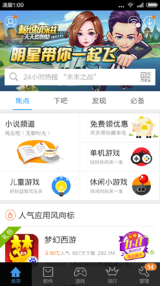 在搜索框下方则是焦点、下吧、发现和必备四大分类,在四大分类下面,则是小说频道、儿童游戏、免费领优惠、单机游戏、休闲小游戏等内容分类,整体布局比较散乱。最下部则是推荐、软件、游戏、排行四个功能模块。