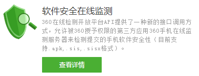 这是360在线检测开放平台API提供了一种新的接口调用方式,允许被360授予权限的第三方应用360手机在线监测服务器来检测提交的手机软件安全性。这一检测环节在应用宝和百度手机助手中都缺失。
