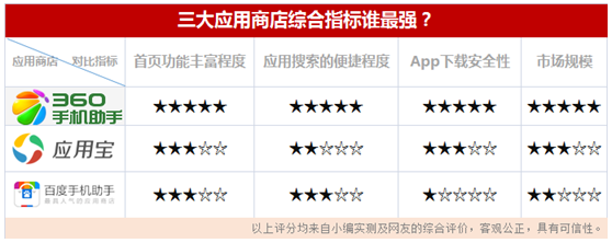 从上面的分析可以看出,360手机助手的“应用搜索”相比应用宝和百度手机助手都更为方便、可信。