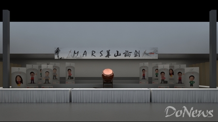 这片区域张贴着“MARS华山论剑”的大展板,像是即将要召开一场武林大会的气势,寓意着参赛者是江湖中的高手,来此地一显身手。展板下面放置了此次介绍预赛14位梦想导师的易拉宝,还有一面威风凛凛的大鼓,若敲响锣鼓,必威震四方。