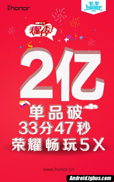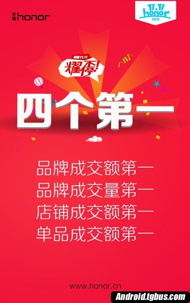 在本次11.11狂欢盛宴中,荣耀11.11开场势如破竹,7分16秒销售额破1亿,16分02秒销售额破2亿,28分31秒破3亿,1小时16分销售破5亿,3点08分销售额破6亿,持续领跑四项第一:品牌成交额第一、品牌成交量第一、店铺成交额第一、单品成交额第一!值得一提的是,35分钟天猫华为官方旗舰店即破3.4亿,超去年全店全天成交额。销售战绩一路飙升,势不可挡。如此增势成为11月11日业内惊人亮点,且狂欢盛宴还在持续进行中。(华为商城:http://www.vmall.com/ry1111.html,天猫华为官方旗舰店:https://huawei.tmall.com/,京东:http://sale.jd.com/act/d5AJV7Y8QcXZ6v.html#top,苏宁华为荣耀官方旗舰店:http://shop.suning.com/70086258/index.html)