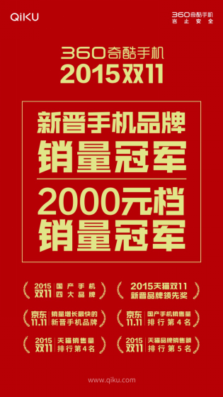 据了解,360奇酷由国内最大的互联网安全公司360和国内老牌手机厂商酷派联合推出,今年8月刚刚发布。虽然正式面世仅仅3个多月的时间,但表现十分抢眼。来自360奇酷官方的数据显示,今年“双11”当天,360奇酷手机全网出货量超过16万台,不仅跻身国产四大品牌,与小米、华为、魅族并称“花旗小妹”,还夺得2000元档手机销量冠军。