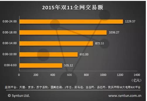2015年双11全网单天交易额高达1229.37亿元,与2014年双11(805.11亿)相比,同比增长52.70%,全网产生包裹数6.78亿个。