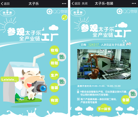 借助QQ物联的技术,消费者可以通过太子乐的公众号、摇一摇等功能区进入到参观交互界面,通过QQ物联的音视频相关技术,借助强大而可靠的腾讯云服务,能够实时采集高清的数字画面,并向全国亿万网民提供实时的视频直播服务,实时展现太子乐从牧场奶源到运输物流的全产业链。