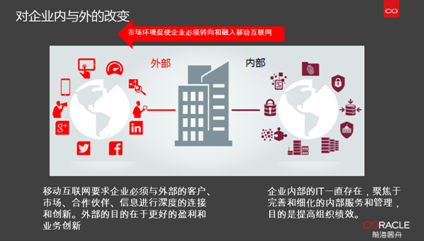 圆舟科技张荣贵认为,移动互联对传统企业的改变,主要体现在三个方面,即效率与管控价值,业务模式创新价值及产品创新价值。而圆舟科技就是依这三种核心价值而生,是一家为企业提供移动化技术平台、应用及整体解决方案的互联网公司。具体到企业自身,移动互联网要求企业必须与外部的客户、市场、合作伙伴、信息进行深度的连接和创新。