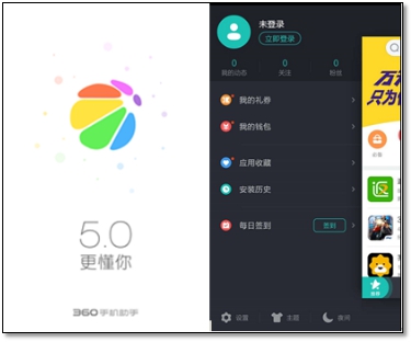 据了解,360手机助手5.0版除了“快”之外,还主打“高、富、帅”三大特点。在界面上首先帅出了新高度,请来Dribbble(Dribbble.com)全球排行TOP 3的华人设计师亲自操刀设计全新界面,逼格极高;福利也多到发家致富,主界面首页就有“福利”按钮,时不时就会有特权、红包、话费、代金券等好礼相送;最后,还推出了应用圈社交攒高人气,根据你的喜好推荐你喜欢的“圈子”,比如“美食圈”、“玩机圈”、“女生圈”、“健身圈”等等。