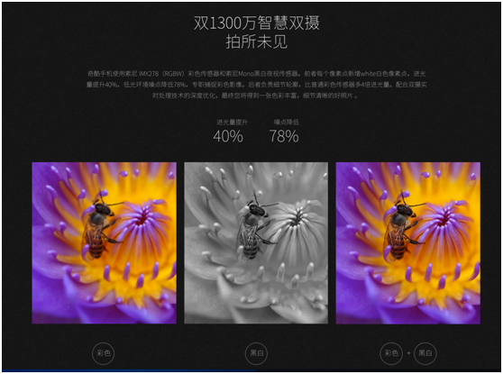 作为360奇酷手机旗舰版最大的亮点,则在于其智慧双摄技术。与其他双摄像头手机均有所不同,它采用独创的“彩色+黑白Mono夜视智慧双摄”,2颗1300万摄像头为1颗彩色镜头和1颗黑白夜视镜头的搭配组合。彩色摄像头采用目前最好的索尼IMX 278四色传感器,增加了白色像素点,可提高亮度减少噪点,其用于记录被摄物体的色彩信息;黑白夜视镜头采用定制的IMX Mono全透光传感器,进光量为普通彩色摄像头的4倍,其用于记录被摄物体的轮廓和细节信息。经旗舰版双摄像头拍摄而成的照片,具有更丰富的细节信息,因此在弱光和暗光环境下表现更佳,甚至可以超越作为业内摄像头调教标杆的iPhone6s。