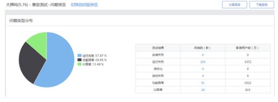 在所有的问题中,大姨吗的运行失败率达到57.87%影响到了103款测试机型,大约有3372万的用户受到影响,有51款终端出现了功能异常,占所有问题的28.65%,有1922万的用户受到影响。UI异常是所有错误中占比最小的,只影响到了24款机型的615万用户。
