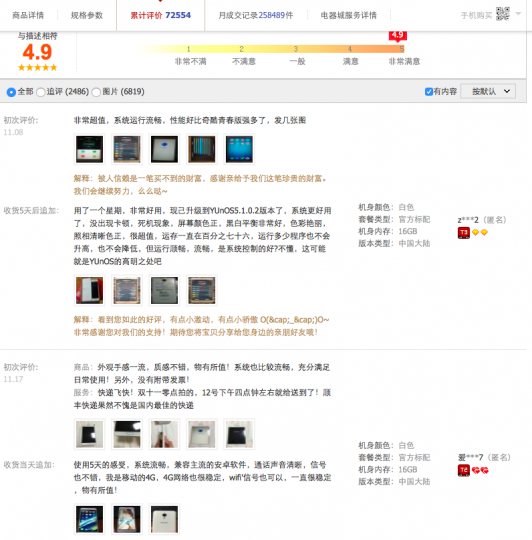 在魅族天猫官方旗舰店,笔者看到魅族的双11“爆款”魅蓝metal评分高达4.9(总分5分),属于“非常满意”等级。消费者的评价大多数集中于:系统流畅、指纹识别灵敏、发货及时物流快、外观好看金属外壳手感好、信号稳定、屏幕清晰柔和不伤眼、待机时间长等。看来绝大多数消费者都对魅蓝metal持肯定推荐态度。