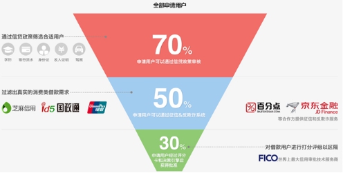 对于每笔贷款,美利金融的审核人员会1)核实借款人的借款意图,身份,学历,收入,联系人,社交信息,银行卡信息,黑名单,设备指纹等一系列反欺诈、还款能力信息;2)把经过反欺诈验证的客户通过申请评分进行评分,一定分数之上的用户才会最终通过美利金融的审批。更重要的是,美利金融并不向借款客户提供现金,而是向他出售商品,并最终和商家结算,极大程度上降低了欺诈风险。另外,关于二手车消费分期业务方面,美利金融会对借款人和购买的二手车标的进行双重审核,对于二手车的审核与估值,包括现场人员检验、确认具体车款、专业评估、车辆抵押情况等多个方面。