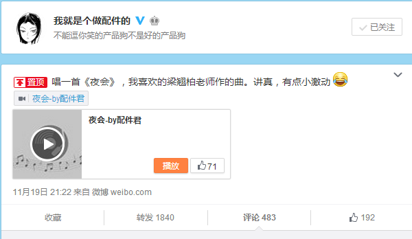 11月20日魅族配件君更是发微博称:“进娱乐圈要注意什么?要整容吗?在线等,挺急的。”11月23日配件君再次转发魅族科技梁翘柏海报,一句“嗯,新专辑叫什么名字好?”进一步印证了魅族进军娱乐,参与“选秀”的可能。