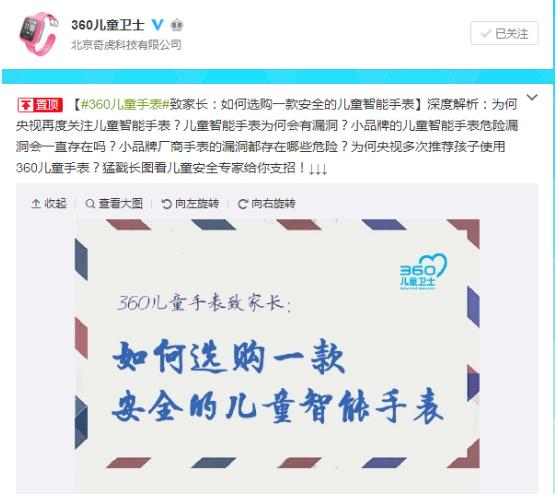 为了给消费者们普及更多儿童智能手表安全相关知识,昨日360儿童手表团队在官方微博@360儿童卫士 发布了《360儿童手表致家长:如何选购一款安全的儿童智能手表》,引发很多公安大号及媒体大号支持及扩散转发。