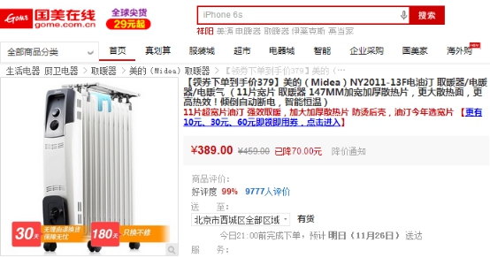 美的电油汀取暖器379元 全民放肆低价购