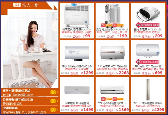 当然,除了小物件的低价实惠以外,室内取暖必备更是低至4折起,以及室外抗寒神器直降3折起。具体来说,室内居家,南极人经典保暖内衣活动价49.9元,美的NTB20-15L取暖器209元,三档调风,温暖一季!60升海尔热水器EC6002-D活动价1299元,伊莱克斯1匹壁挂式定频冷暖空调EAW25FD13BA1活动价1499元,作为 1匹经典挂机,底价直标;已爆售近2万台,好品质,值得信赖!