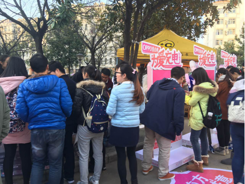 素有“万人迷”之称的OPPO R7s,现场化身成为了为爱充电装置!玫瑰金的闪亮外观,点缀了校园各个角落,成为校园一道亮丽的风景。学生都被亮丽的色彩吸引,纷纷而至。活动一开始,OPPOR7s为爱充电的现场引来了大量的学生围观,呈现一幅人山人海的景象。尽管冬日的寒风潇潇,但是学生的热情毫不退减。纷纷掏出手机充电,扫码,为爱告白。也许正是这种情感的触动,现场的火爆场面,已然成为了冬日里的一把火,暖化了这三所跨越中国南北的校园!