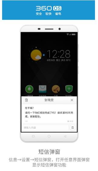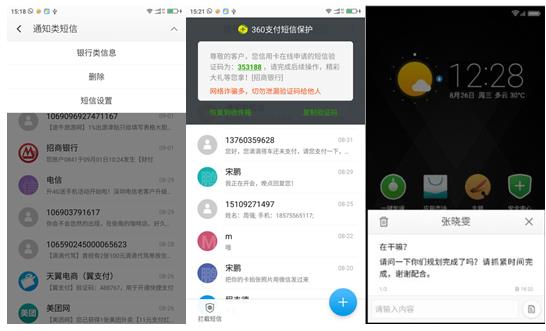 360 OS在短信功能则更加人性化:360 OS短信应用可以对通知类短信进行智能分类,将杂乱的通知类短信归类存放,还你一个干净的界面;当你用手机购物或者查询操作时,一般会收到支付的验证短信;360 OS智能卡片式短信,可以把复杂的短信内容智能的提取出来,把用户关心的重点内容集中展现,免去你看一大推文字的烦恼。同时,360 OS的短信弹窗功能也深受用户好评。当你在看视频、看网页、聊微信时突然来了条短信,360奇酷手机在底部弹出一个对话框,你可以浏览短信内容、删除短信,还可以在对话框里直接回复短信,无需进入短信应用中操作,非常方便。