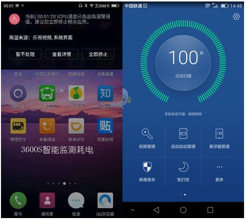 这个耗电管理也是360OS强项,360以前做过360省电助手APP专门解决手机耗电问题,相信安卓4.4以前的用户肯定都安卓过这软件。对比EMUI4.0的基础功能,360 OS还有热源追踪、黑白省电模式、触屏省电等技术,360 OS能够智能监测长期占用CPU导致手机发热的应用,一键关闭上火应用,让你的手机从此不再发烧,增加电池续航,黑白省电模式,屏幕瞬间变为黑白状态,大幅减少电量消耗,且不影响正常的通信功能,低电量时帮你避免漏接重要电话,即使剩余5%的电量,也能续航10小时。很明显看的出来,360 OS省电才是做的真的靠谱。