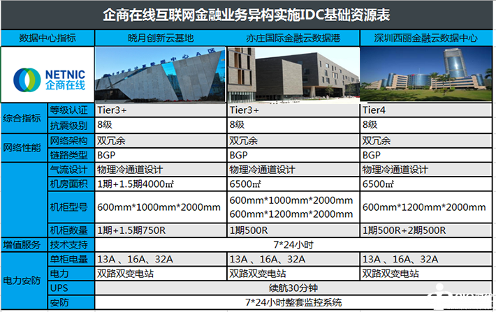 值得一提的是,此次企商在线为借贷宝实施两地三中心提供的三大数据中心均为2014年至2015年新建的新一代高可用高可靠性数据中心,建设标准按照国标GB50462-2008及GB50174-2008 A级标准及国际Tier3+标准,深圳西丽金融云数据中心采用国际Tier4最高标准设计。并且均通过ISO20000\ISO27001国际质量管理体系双重认证,这也标志着企商在线所提供的网络基础设施服务在信息安全管理标准和IT服务标准化方面已达到国际认证的最高标准。