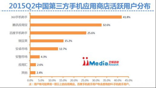 国内另一家市场咨询公司艾媒在《2015 Q2中国手机应用商店市场研究报告》中也显示,截止2015年Q2,中国第三方手机应用商店活跃用户规模已达到4.28亿,其中360手机助手的活跃用户一举夺得41.8%份额,位居第三方应用商店首位。