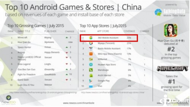 而国内新兴的数据公司TalkingData的一份名为《2015中国移动互联发展指数数据报告》的公开文档中指出,截至2015年7月,360手机助手以29.9%的市场覆盖率继续领衔国内安卓应用商店市场。