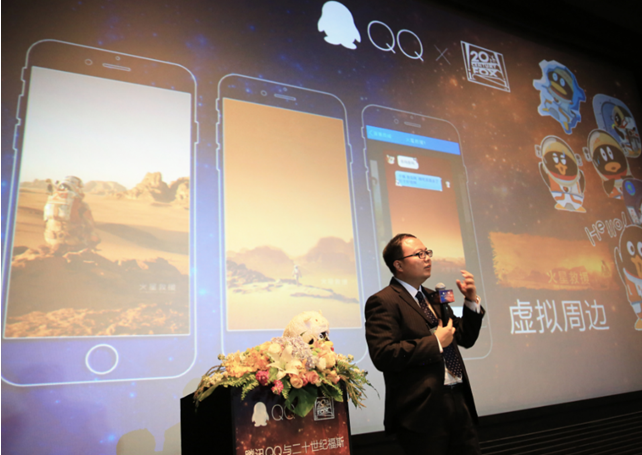 12月3日,腾讯 QQ 与二十世纪福斯联合推广战略合作发布会在北京举行,双方宣布将会以《火星救援》电影合作为契机,持续展开电影授权、植入等多元化合作。除此之外,QQ还首次对外披露了“娱乐社交”战略,以本项与20世纪福斯的合作作为出发点,会通过虚拟周边、社群运营和联合推广等方式, 开展电影方面的合作,重点挖掘娱乐产业和QQ相结合能给用户带来的价值。