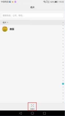 点击“扫名片”即可进行名片扫描。扫描完毕,名片信息将即时收录入通讯录中。