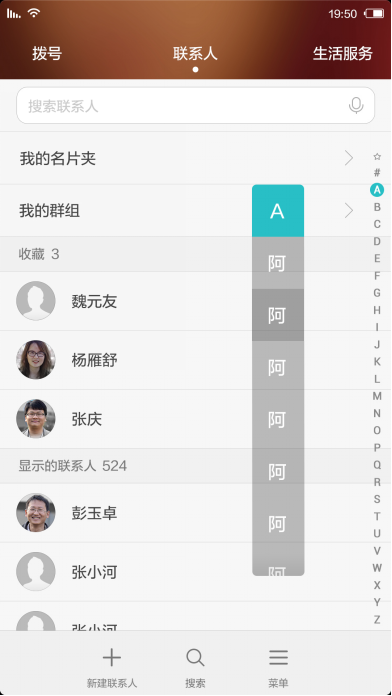 EMUI 4.0新增快速检索联系人功能,利用二级检索提高检索速度,根据姓氏拼音查找联系人效率更高。当你点击联系人姓氏首字母,如果其下有多个汉字姓氏,则二级索引中列出,将联系人查找范围缩小,提高检索效率。
