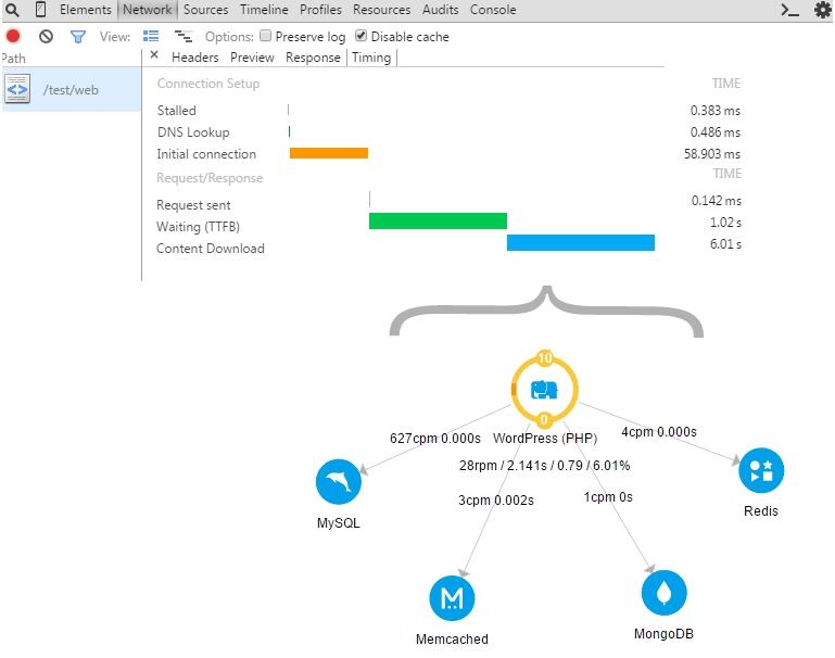 听云Server For PHP1.4.0版本已经全面实现了服务端应用之间、服务端应用与浏览器端应用、服务端应用与网络应用间全部的跨应用追踪功能。对于听云Network产品,可以将第一个包时间细化为听云Server产品的性能指标,并跟踪到服务端端慢过程跟踪中。