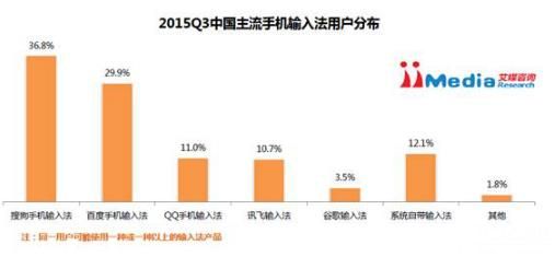 iiMedia Research(艾媒咨询)数据显示,2015Q3中国手机输入法用户分布方面,搜狗输入法和百度输入法处于市场第一梯队,分别占比36.8%和29.9%,QQ输入法、讯飞输入法等第二梯队成员每家分占10%左右,与搜狗和百度输入法的差距比较大。