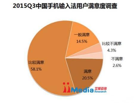 iiMedia Research(艾媒咨询)数据显示,有20.5%的用户满意当前主要使用的手机输入法,58.1%的用户比较满意,14.5%的用户一般满意,绝大部分用户对使用的输入法持正面评价,因此手机输入法用户对输入法的总体评价较好。