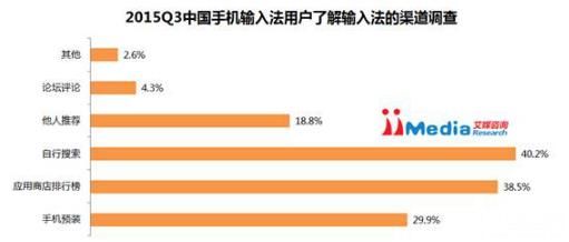 iiMedia Research(艾媒咨询)数据显示,用户主要是通过自行搜索、应用商店排行榜、手机预装和他人推荐等方式了解手机输入法,其中自行搜索和应用商店是最主要的方式。
