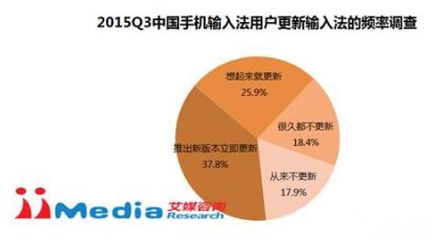 iiMedia Research(艾媒咨询)数据显示,37.8%的用户在新版本推出后会立即更新,25.9%的用户只是想起来才更新,18.4%的用户很久都不更新,还有17.9%的用户从来不更新,这表明用户主动更新输入法的主动性并不高。