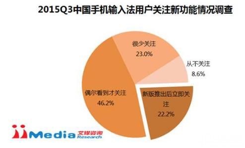 iiMedia Research(艾媒咨询)数据显示,仅有22.2%的用户在新版本推出后会主动关注手机输入法的新功能,大多数用户偶尔关注或者很少关注(分别占比46.2%和23.0%),当前输入法用户关注输入法新功能的积极性不高。