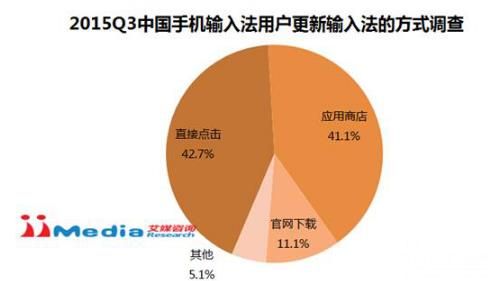 iiMedia Research(艾媒咨询)数据显示,42.7%用户直接点击软件更新,41.1%的用户会去应用商店更新输入法,还有11.1%的用户会去手机输入法的官网下载更新。
