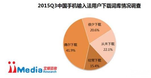 iiMedia Research(艾媒咨询)数据显示,仅有15.4%的用户经常下载词库,大部分用户只是偶尔、很少或者从未下载(分别占比41.9%,20.6%和22.1%)。艾媒咨询分析师认为,下载词库可以迅速提高输入的快速性和准确性,特别是输入某些专业领域内容之时。