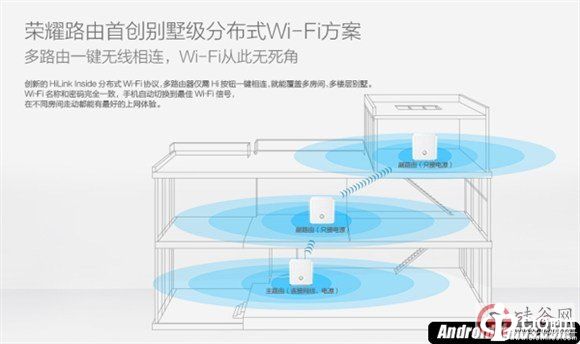 更加值得一提的是,针对别墅户型和复杂户型出现的信号减弱、死角频现的情况,荣耀路由提出了业内独有的“分布式Wi-Fi”解决方案。即将两台或多台荣耀路由一起接上电源,其中一个作为主路由接入网线设置好,再按下“Hi”按钮,荣耀路由间就会自动进行数据同步。待“Hi”键呼吸灯变为稳定绿色灯光,完成无线信号扩展的同时,让用户享受真正的无缝漫游。