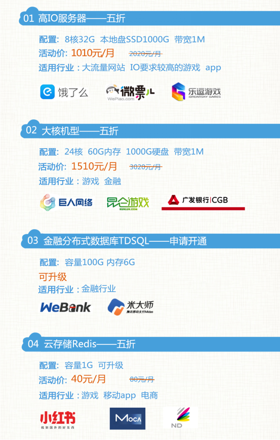 腾讯云名企同款服务器,除了气质爆表,价格也是无懈可击。12.21腾讯云出大招,拯救程序猿,欢乐过元旦不是说说而已。广大程序猿们注意啦:前方高能预警,优惠信息出没,不容错过。腾讯云4款新品五折,包括高IO服务器、大核机型、云存储、金融分布式数据库TDSQL,到底多优惠,看图。
