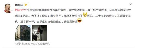 图2:周鸿祎微博调侃在西安交大曾住过的宿舍依然杂乱