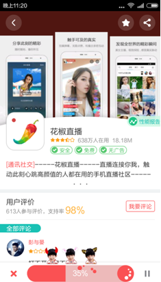 在360手机助手TFBOYS中随便下载一款App,譬如小编以下载“花椒直播App”为例,如下图所示,在下载的过程中,向前滚动的进度条上方一直犹三小只守候。