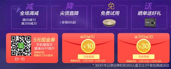 从12月7日开始,360商城的用户都可以在平台上领取10元、30元的满减券,除360行车记录仪单机和360儿童卫士智能手表3外,凡购满99元或399元就可以使用并减免等额的费用。此外,使用手机端购物的用户,登录即可获得5元代金券,没有任何使用限制。当然,代金券和满减券是无法同时使用的。