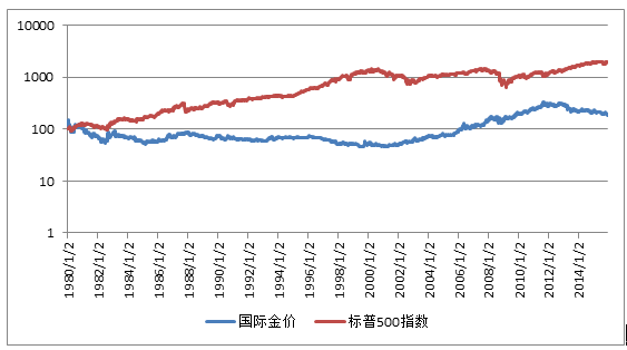 我们选取1980年至2015年的国际金价、标普500指数(用来衡量美国股票市场)数据做综合考察。为更直观地比对二者变化,将1980年1月的两个曲线基点数字统一设为100,按照同等比例折算,再得出lg变化曲线。