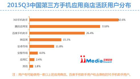 在Q1的报告中,艾媒指出,在中国手机第三方应用商店用户活跃度排名方面,360手机助手位列第一,腾讯应用宝以及百度手机助手用户活跃度紧随其后;而在Q2的报告中,艾媒认为,第三方应用商店格局基本稳定,360手机助手占据前列;到了2015年的Q3,艾媒认为,国内应用市场格局保持稳定,360手机助手增长8个百分点达42.6%,依然位居第一。