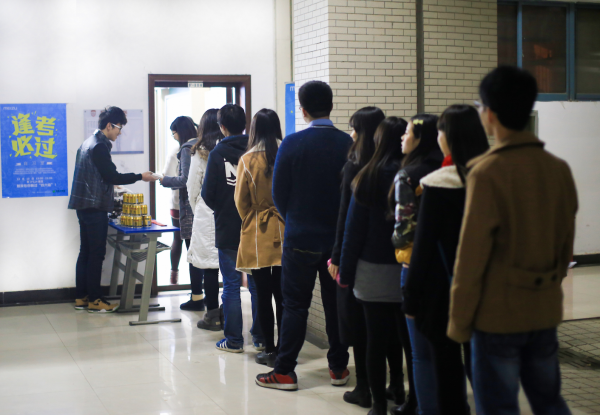 12月9日,在广州市大学城里的中山大学校区,记者看到魅族“逢考必过自习室”在众多教学楼教室中非常醒目。晚上7点还未到,自习室门口已经排起长龙,学生们依次从门口工作人员处领取饮料、高热量零食、文具套装、“不挂福袋”、只安装和英语学习相关软件的魅蓝metal手机等物品后进场,自习室内还有学霸级师姐辅导。由于一个自习室只能容纳50人左右,有些没有位置同学只能“抱恨而归”等第二天再来。
