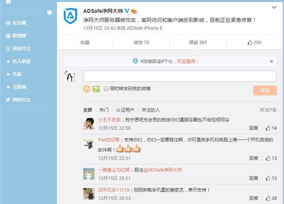 净网大师官方认证微博在昨日发帖称ADSafe官网正被攻击中,时至今日服务器还没有恢复正常访问。关注这起案件的朋友心知肚明,净网大师被“我们”捧的很高,按常理不会有我们民间的组织来对净网大师发起这么卑鄙的进攻手段。后面的我就不说了,你们自己揣摩。攻击净网大师官网为的就是让这款软件不能给大家提供服务,而又是谁想这么做呢?