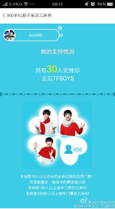 抽票的规则很简单,只需要在360手机助手中获得一个二维码,并将其分享到微信朋友圈、微博等处,让好友为你投票即可。按照活动的规则,获得10人以上支持的用户,才有机会抽取TFBOYS水立方门票,而获得100人以上支持的用户抽中的概率翻倍!获得1000人以上支持的用户抽中的概率X3!