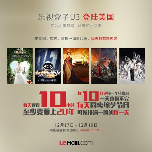 乐视专为海外华人精心打造的全新乐视盒子U3已于今日登陆美国乐视商城,并正式在美开启为期3日的限量邀请活动。12月17日 - 12月19日期间,登录美国乐视商城LeMall.com/US乐视盒子U3活动页面,注册参加限量邀请制活动,在有机会以$79.99的价格购得一年乐视网全屏影视会员后,即可免费获赠价值$89.99的乐视盒子U3一台(免运费)。