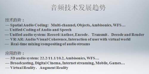 然而在音频方面国、内外还存在很大差距。青衿科技科技创始人、天籁K歌CEO潘兴德博士总结15年对音频技术的研究与观察,“在互联网领域,音频目前已经涉及到很多技术,核心技术包括声音编解码技术、声场技术(立体声、环绕声、全景声、VR/AR)、音效技术(均衡、混响、立体声增强、低音增强等)、消声除噪技术、回声抵消(AEC、啸叫抑制)、人工智能(识别、打分、评价)、版权保护(DRM、水印)这七大技术。声音技术的好坏不仅影响应用的用户体验甚至会损伤到人们的听觉器官,应引起产业界充分的重视。”