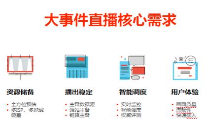 大型直播要做好四方面的准备。武爱敏表示:“ 第一,资源储备。视频直播会涉及到很大带宽,很大的流量,如何获取这些资源是首先要考虑的。第二,对于大型直播,尤其是对于政治性直播,稳定性、安全性要严格保障。第三,调度。在正常直播过程中,即便做了很多预案,还是会出现意想不到的突发事情,极其考验应变能力。第四,用户体验。不管是整个资源评估,还是整个安全播出的架构,还是整个调度系统,实际上都是为用户体验做准备:直播没有卡顿、用户接入迅速成为评价视频直播的主要指标。”