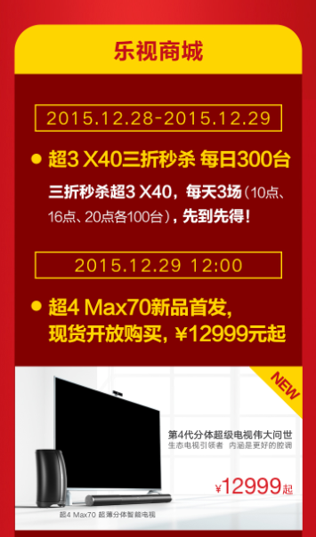 12月29日12:00,超4 Max70新品首发,现货开放购买。超4 Max70于12月22日在北京正式亮相,据了解,其搭载了全球唯一十代线夏普SDP提供的70吋4K面板,支持3D,并在国内首次采用康宁玻璃导光板(Corning IrisTM Glass),是全球首家玻璃导光板超薄分体智能电视超。此次是超4Max70首次开启销售。